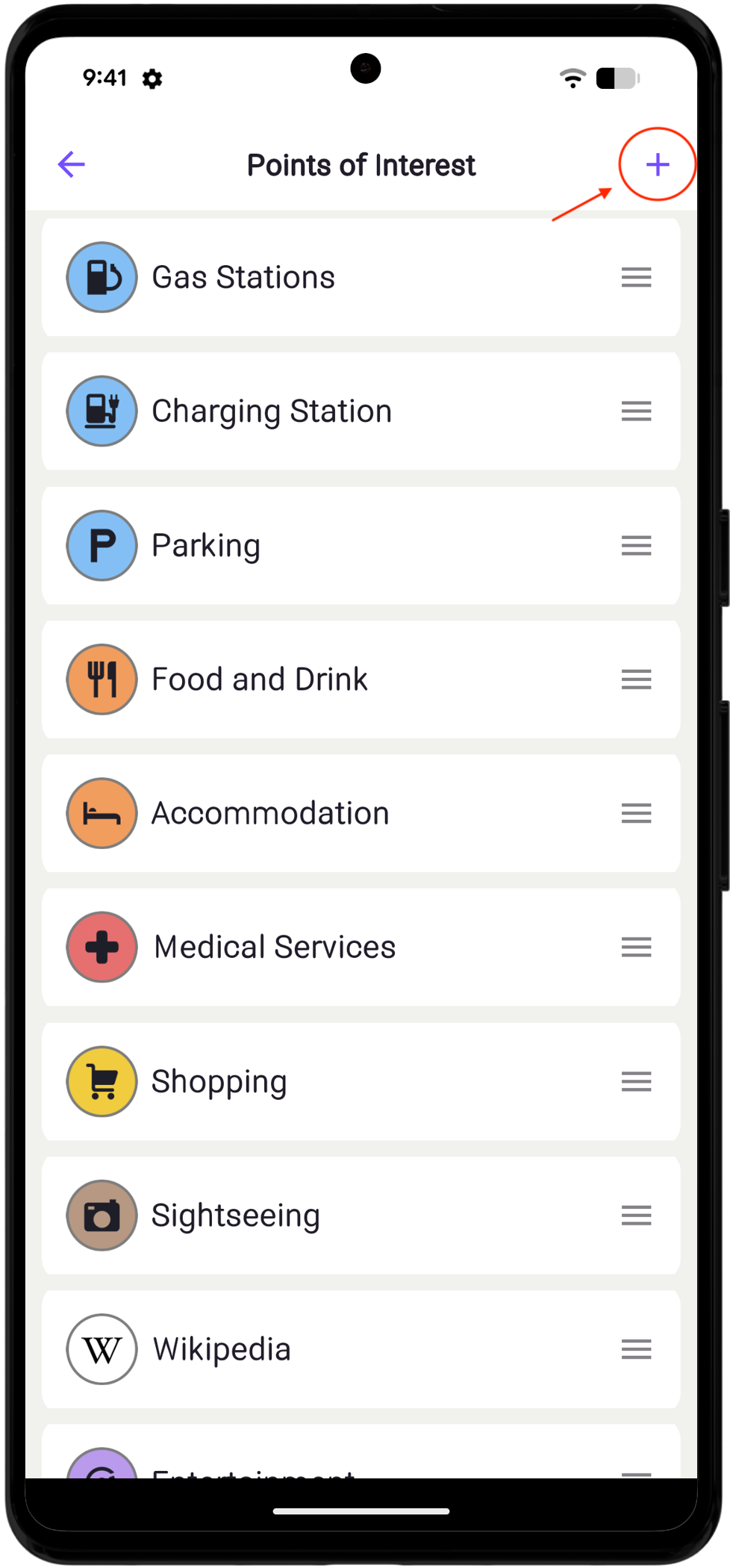 In the Points of Interest screen, tap the plus (+) button to add a new item.